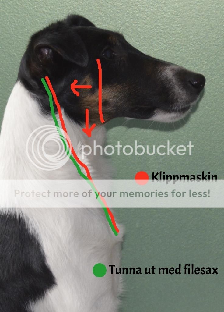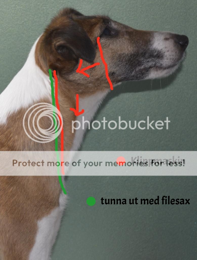 7. Nu tar vi och filear ur på hals och front. På halsen så tunnar vi ur så den rakade kanten inte blir lika fram trädande och det blir en mjuk linje mellan rakat och "päls Kanten". Sedan så fixar vi huvudet tar bort morrhår så vi får en "putsad" finish med raka linjer.